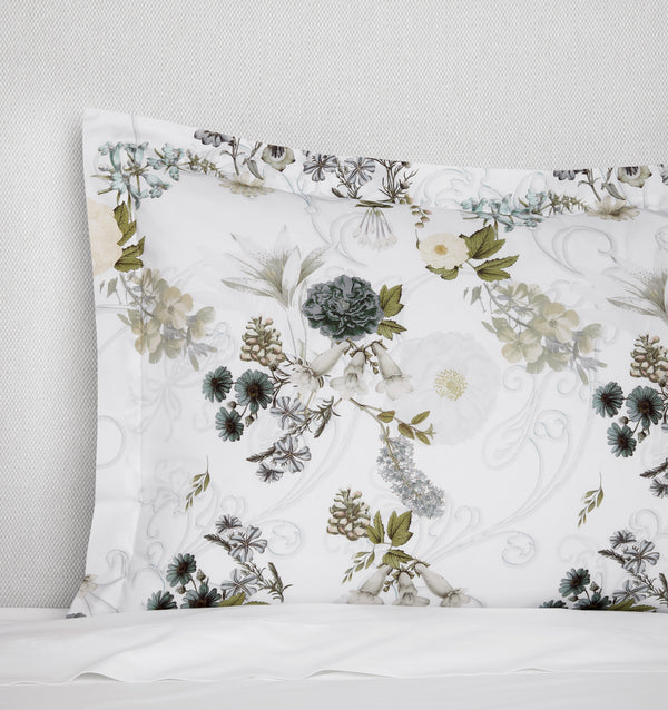 There’s a hush to Incanto, as if the flowers themselves are mid-whisper. Printed on smooth Italian percale, its delicate botanicals bloom in soft, painterly strokes—each petal and leaf rendered in shades of blue, green, and ivory that feel gathered from a dream. The composition is airy yet intentional, a careful arrangement that brings the calm of a garden indoors.
